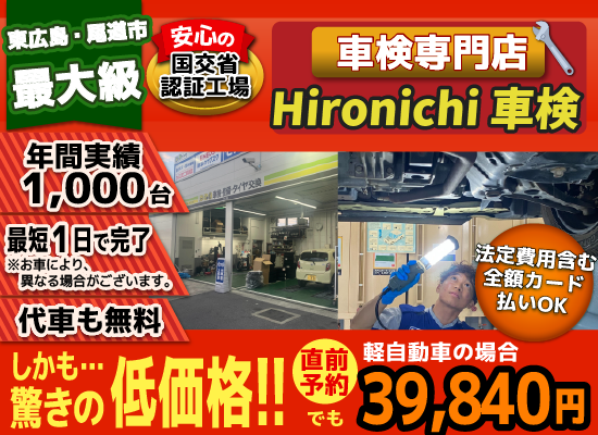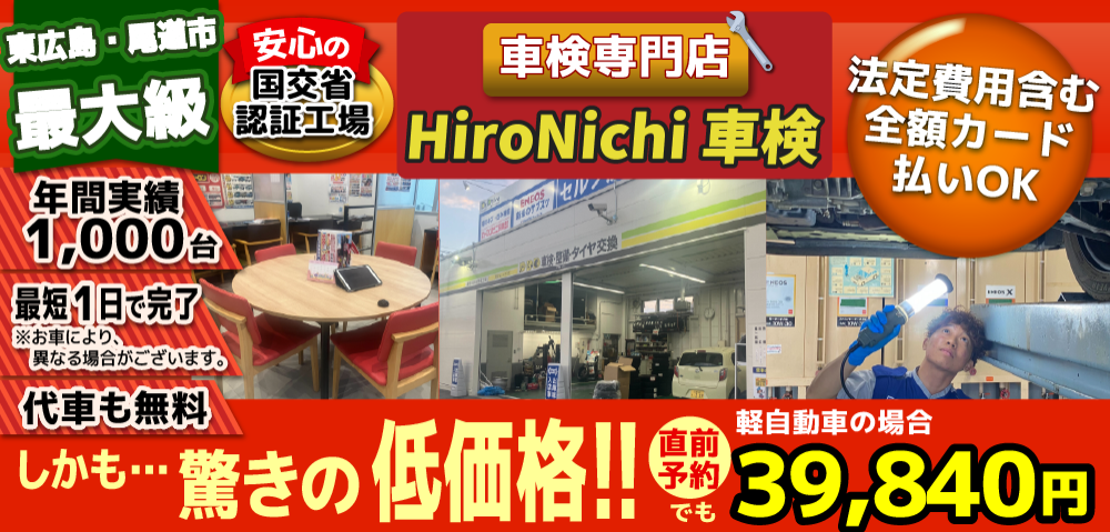 ②カーディーラーと違い、車を販売する為の営業マンの人件費や折込みチラシ等の費用がかかっていない為、その費用分を安く、東広島市、尾道市、三原市、竹原市、呉市、熊野町エリアのお客様に車検をご提供!